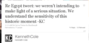 By now you’ve heard about this tweet issued by fashion designer Kenneth Cole where, in an obvious case of insensitivity, he tried to connect the world-changing events in Egypt to his spring line: